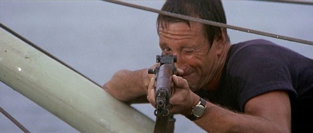 3) That Explosive! Shark Tank Ending – Ah, to return to the days when Spielberg still knew how to properly close out a picture with a bang, before he started whiffing all his denouements and undercutting his own directorial efforts with self-important explanatory bookends (see the otherwise fantastic Saving Private Ryan, Munich, and Minority Report for examples). Preposterous though it may be, you just can’t beat Roy Scheider taking pot shots with a rifle at an oxygen tank improbably lodged in a Great White’s maw, until it detonates the monster in a glorious spray of blood and gore raining down on the ocean as Brody cackles with triumphant glee. It had me cackling as well this time, even after Dreyfuss’s Hooper reemerges from presumed underwater death, and the two paddle away together on the wreckage exchanging throwaway banter as credits roll.